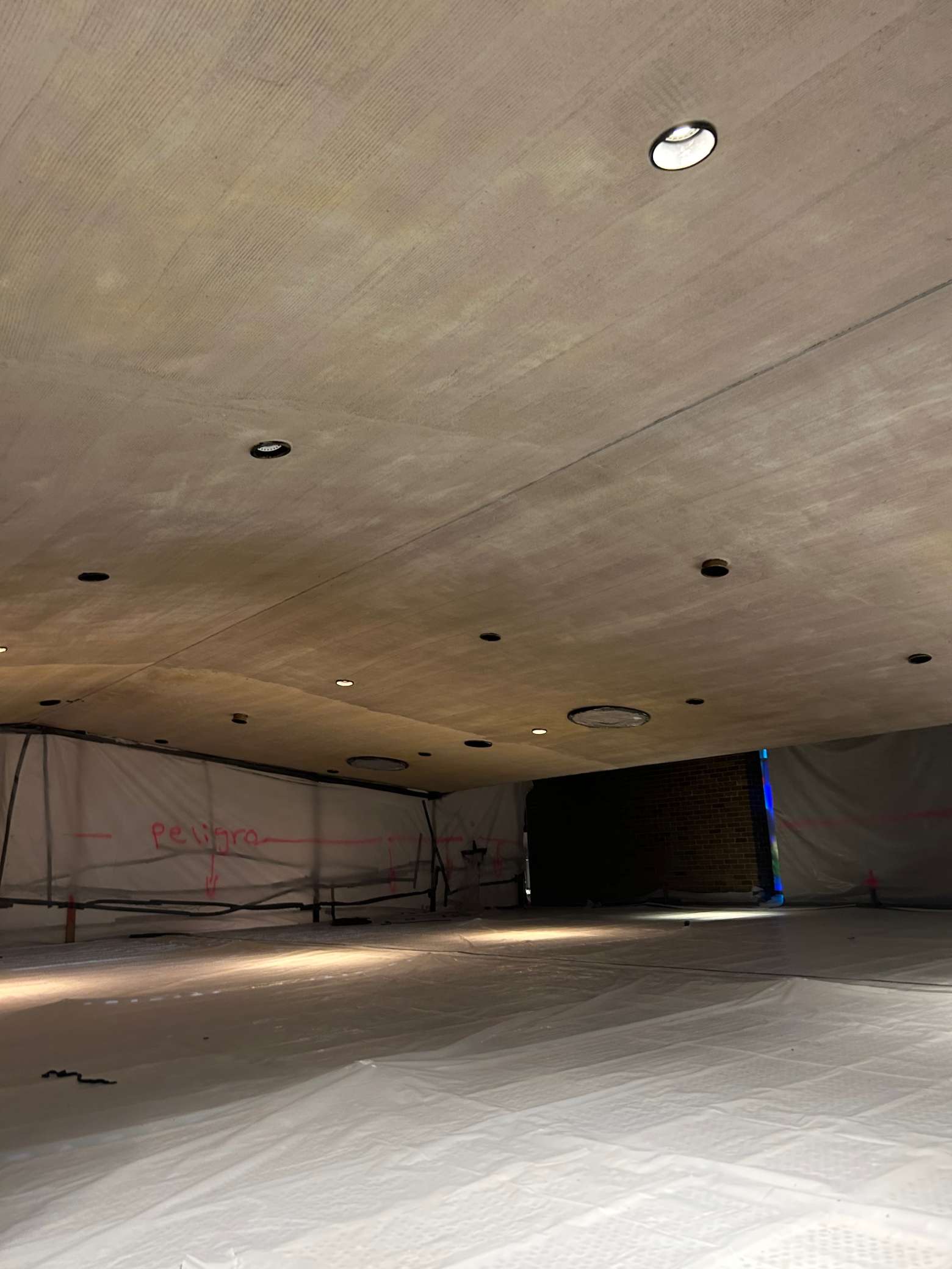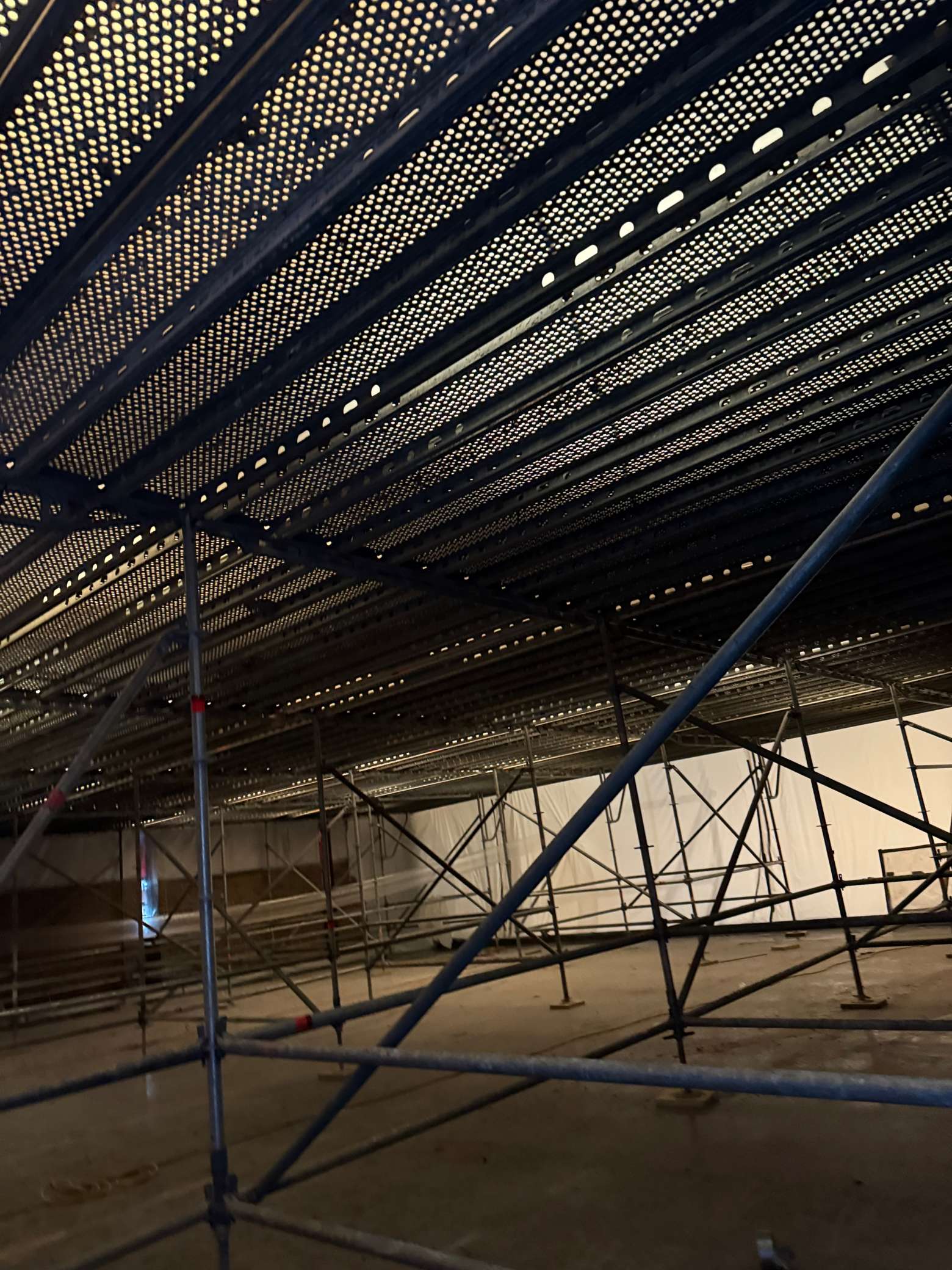 The scaffolding system will remain in place for months to come since it will be needed for the installation of the new ceiling, lighting, wiring, air handling, etc.