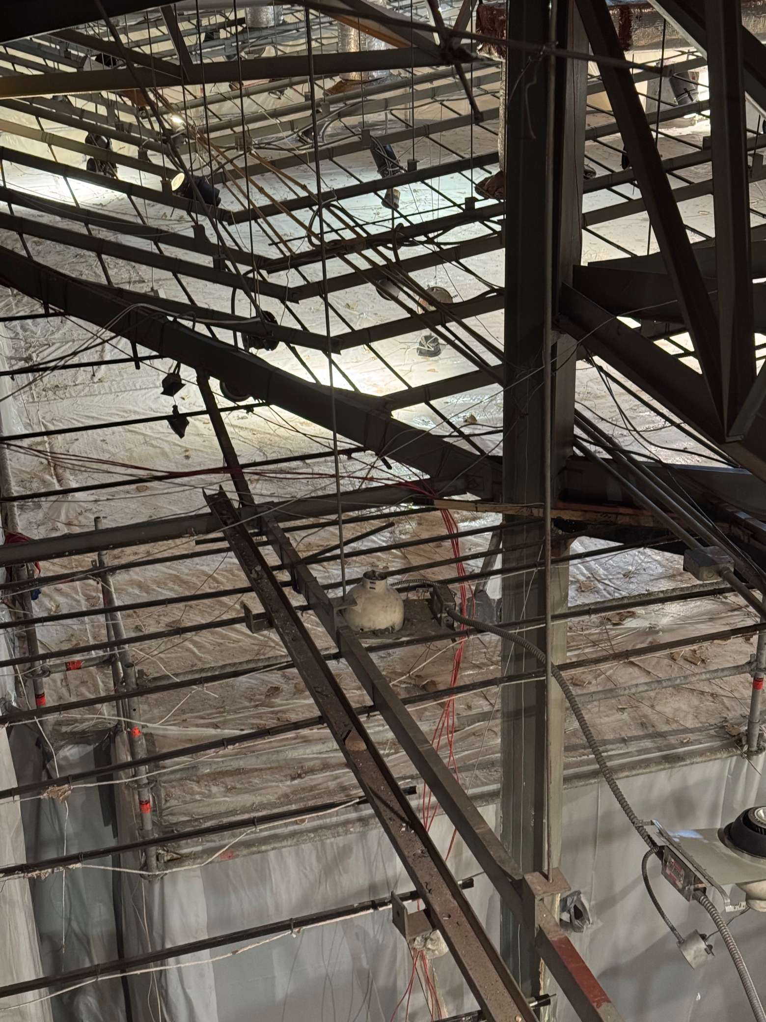 This photo shows the ceiling entirely removed. The photo looks down from the catwalk system above the original ceiling and down into the church, where you can see the covered scaffolding below. As you can tell, the crew has made significant progress. All that remains of the original ceiling is the metal structure used to support it.