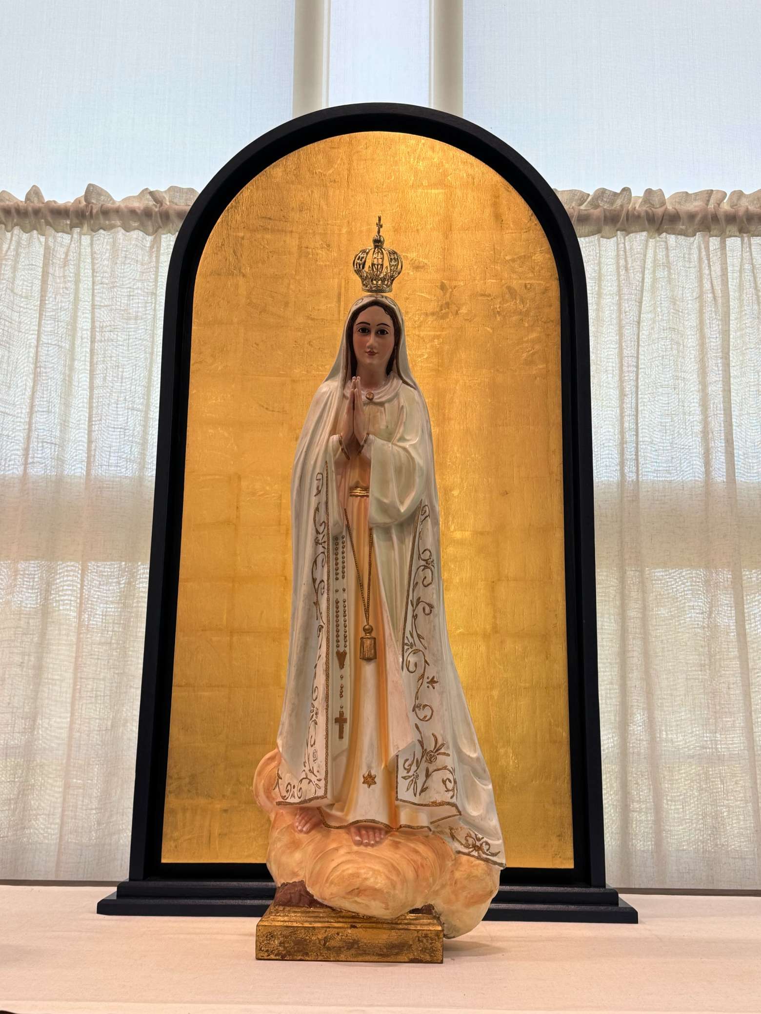 In preparation for our move back into the renovated church, we have sent the original wood statue of our Blessed Mother to be cleaned and refinished. In the meantime, you see the statue of Our Lady of Fatima in place at the Blessed Mother's altar in the PAC.