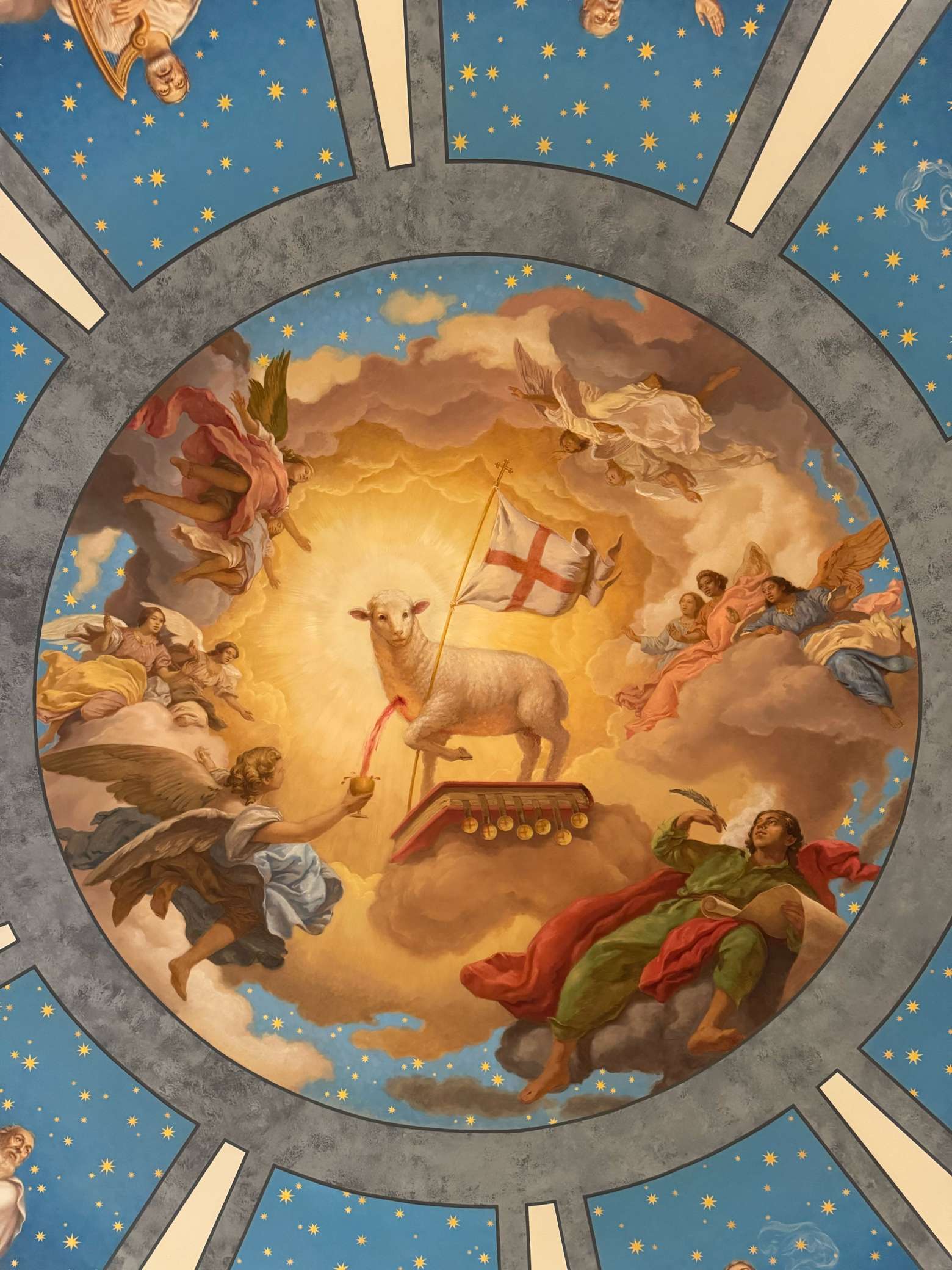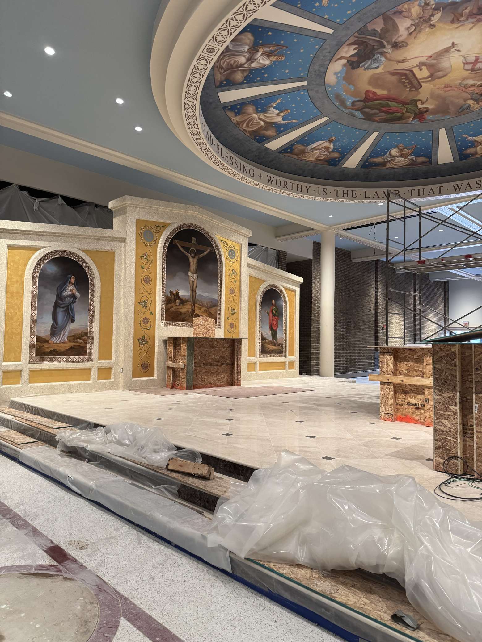 The artists from Conrad Schmitt Studios have installed almost all of the new paintings we commissioned. In the photo below, you can see the reredos with the images of Jesus on the Cross, Mary, and John. Above them, you can see a portion of the dome with Christ represented as the Victorious Lamb and a portion of the Scripture text from Revelation Chapter 5. The dome lighting is not turned on in this photo, and the full lighting package in the sanctuary has not yet been installed.