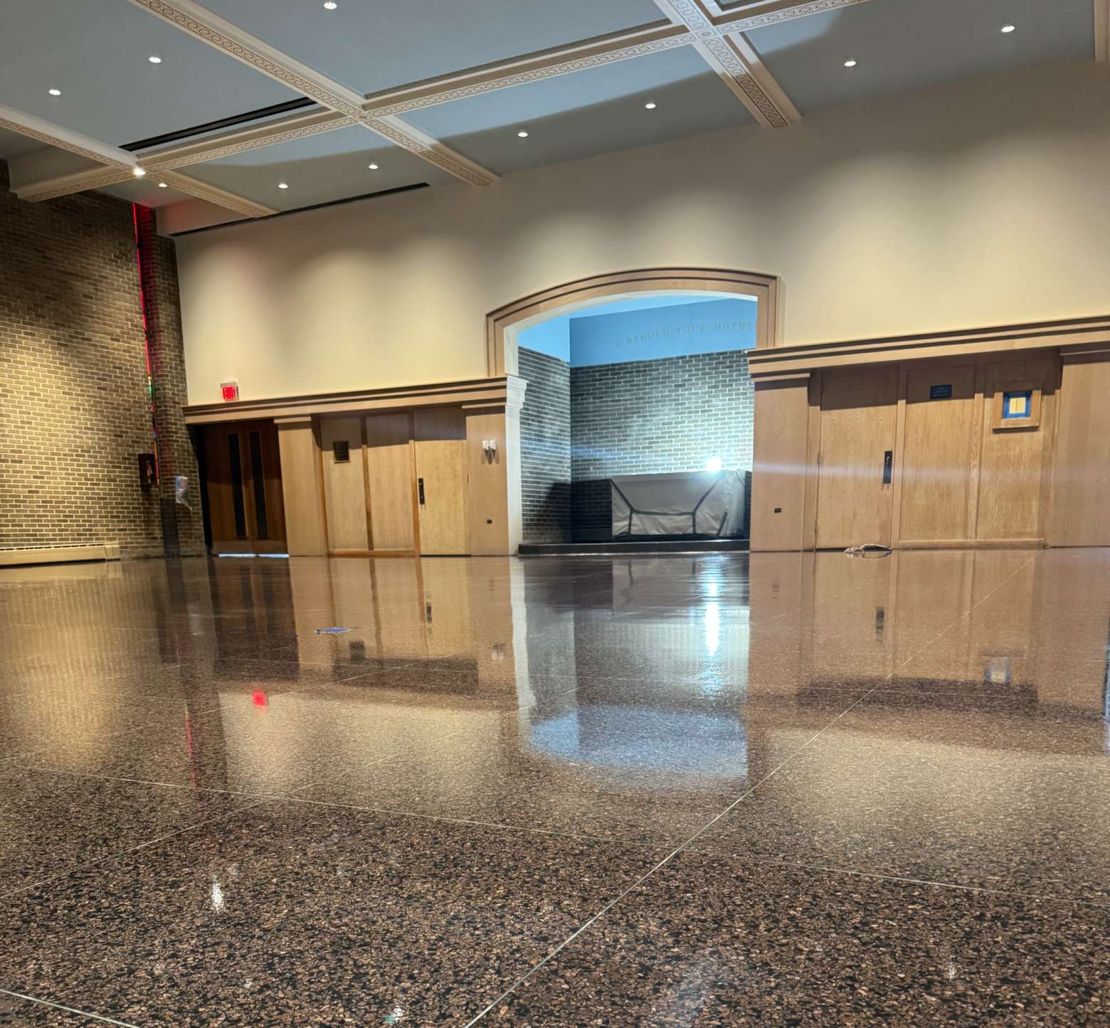 Crews have begun grinding down and polishing the original terrazzo flooring in the three transepts of the church. With years of wax, wear, and tear removed, you can see the beautiful shine of the stone once again.