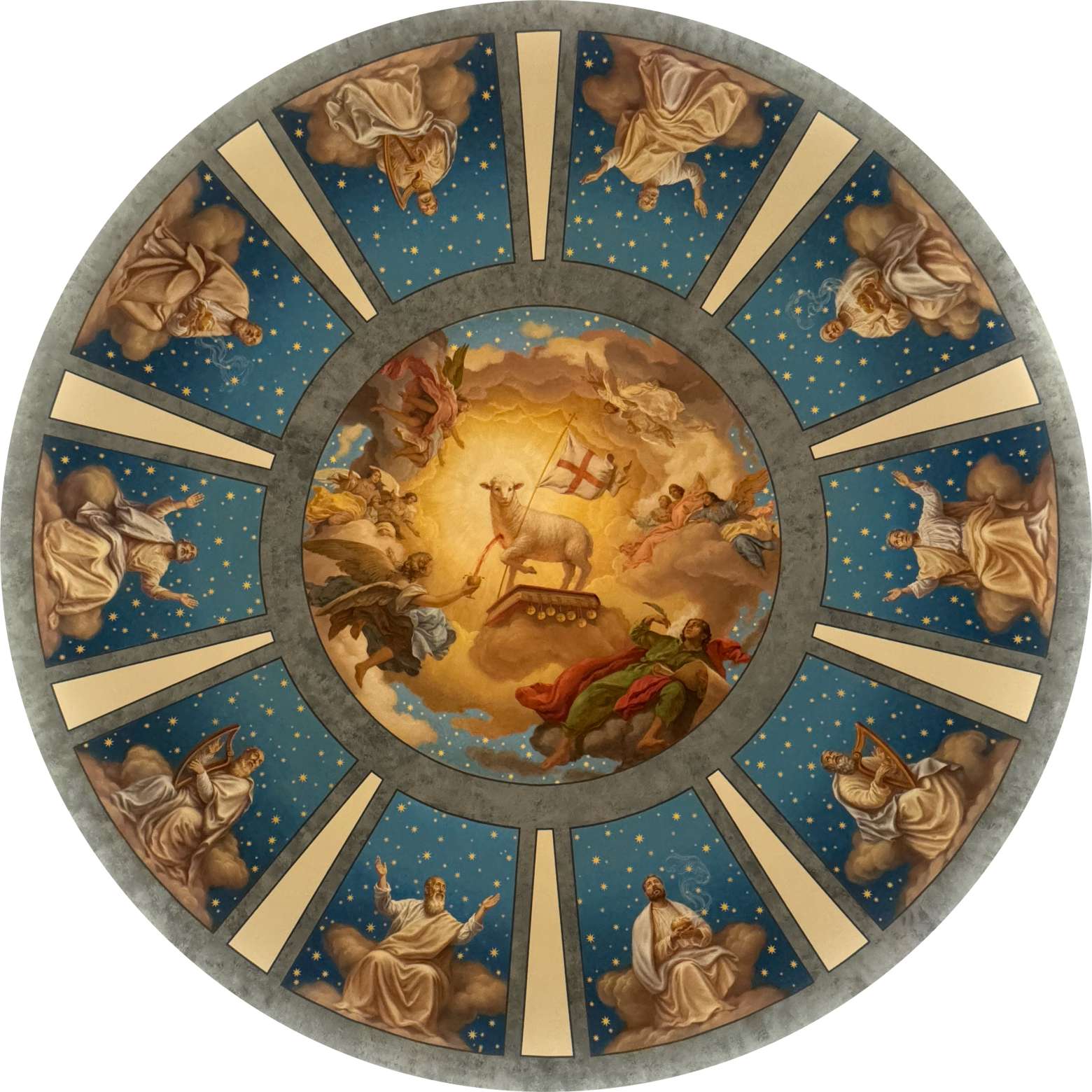 Above the entire sanctuary, the scene from Revelation 5 is beautifully painted in our new dome: the image of the elders worshipping Christ, the victorious Lamb of God. The image in the dome reminds us that at every Mass, earth and heaven join in worship of Almighty God. The dome painting invites us to unite our worship with the angels and saints in heaven as they worship Jesus, the Lamb of God.