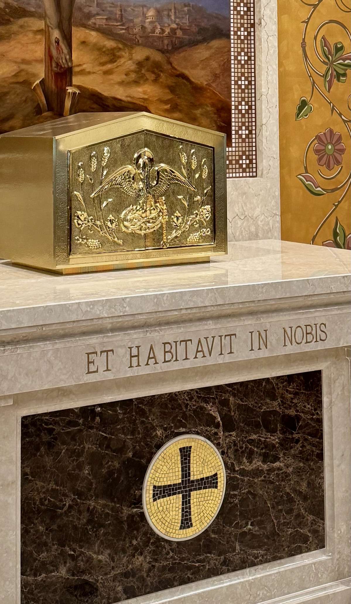 Below, you can see our newly restored tabernacle, which has been completely refinished. It is now mounted and secured on the tabernacle pedestal, which bears the Latin inscription from John 1:14, "And Dwelt Among Us," completing the verse inscribed on the altar. At every Mass, Jesus, the Eternal Word, becomes Flesh and remains with us, truly present in the Sacrament of his Body and Blood reserved and honored in the tabernacle.