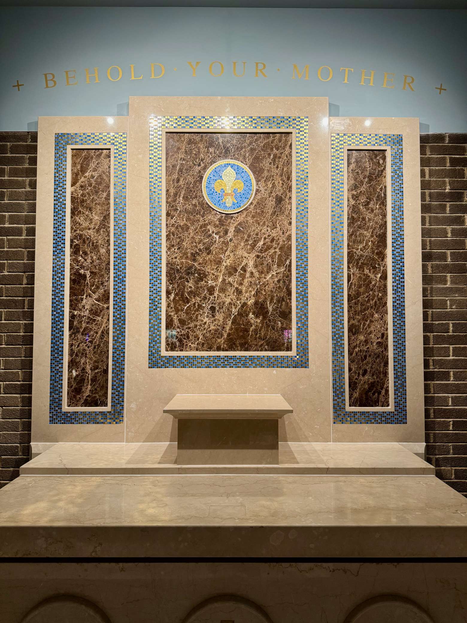 The renovated shrine to our Blessed Mother continues the use of mosaic found in the sanctuary. Below you can see the beautiful fleur de lis that will rest above the statue of the Blessed Virgin Mary (which is currently being cleaned and restored).