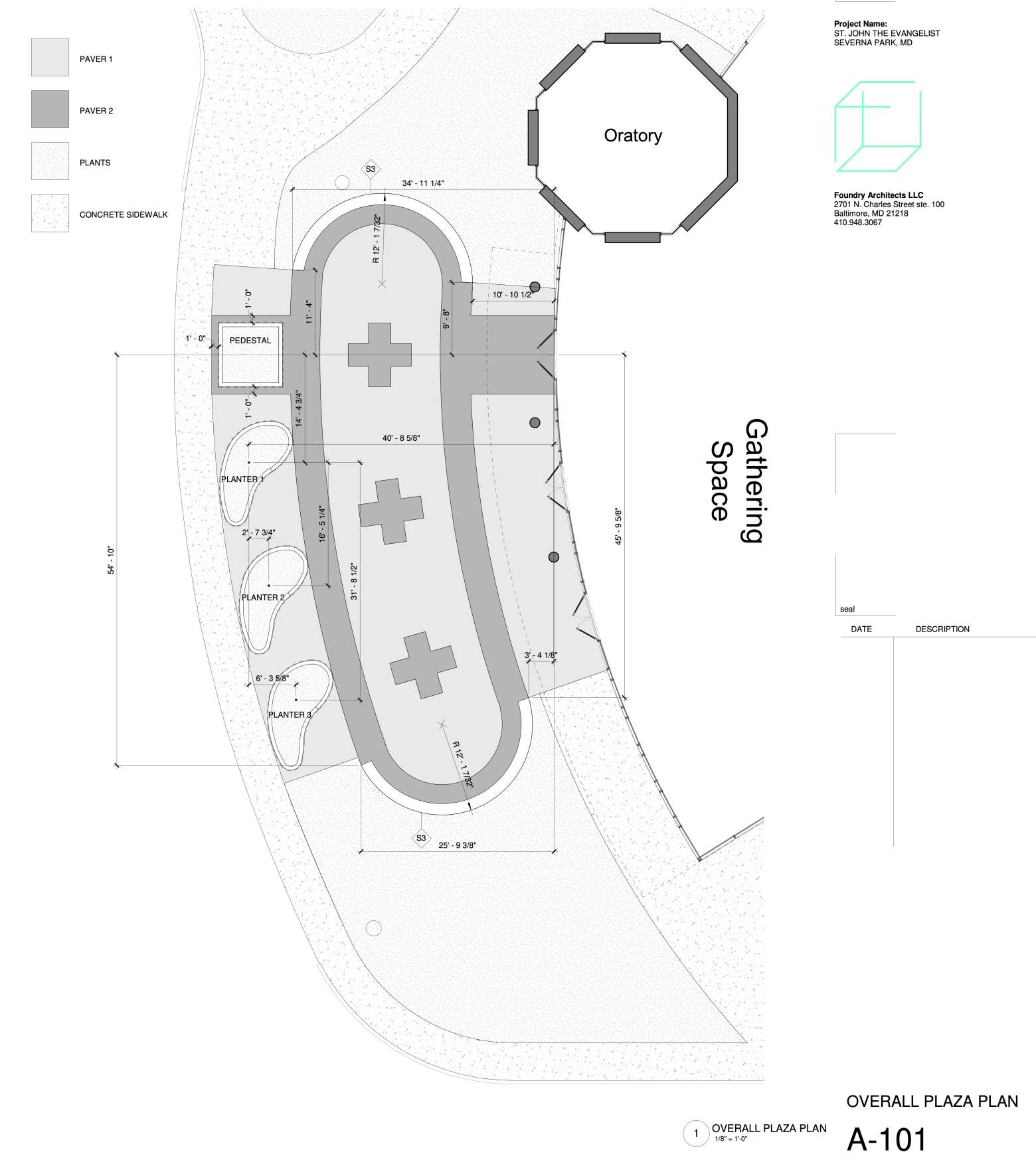 - Concrete pavers will be used for the plaza, in place of poured concrete. Two different colors of pavers will be used to visually break up the space. The different colors will be used to create three crosses in the paver area, visually linking the plaza to the sacredness of the church itself.